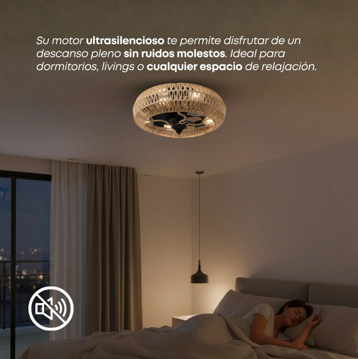 Equipado con 7 aspas de ABS en color negro, ofrece un rendimiento óptimo con una velocidad máxima de rotación de 214 rpm. Su funcionamiento silencioso, con un nivel de ruido de solo 30 dB, garantiza un ambiente tranquilo, ideal para dormitorios o salas de estar.
