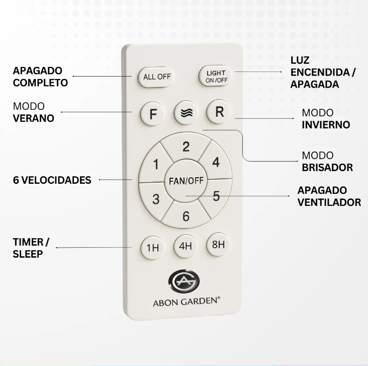 Este modelo cuenta con 6 velocidades y una función turbo, permitiendo ajustar la intensidad del flujo de aire según las necesidades del momento. Además, su control remoto facilita el manejo desde cualquier lugar de la habitación, mientras que la opción de programación añade comodidad a su uso diario.